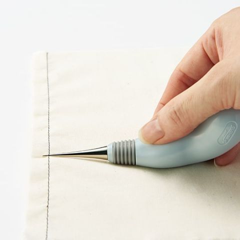 Führt den Stoff, löst Nähte. Die abgerundete Spitze ermöglicht die Zufuhr von Stoffen und Entfernung von Nähten, ohne den Stoff zu beschädigen. Das Spatelende der Kappe kann zum Herausdrücken der Ecken verwendet werden. Ergonomischer Griff in Auberginenform.